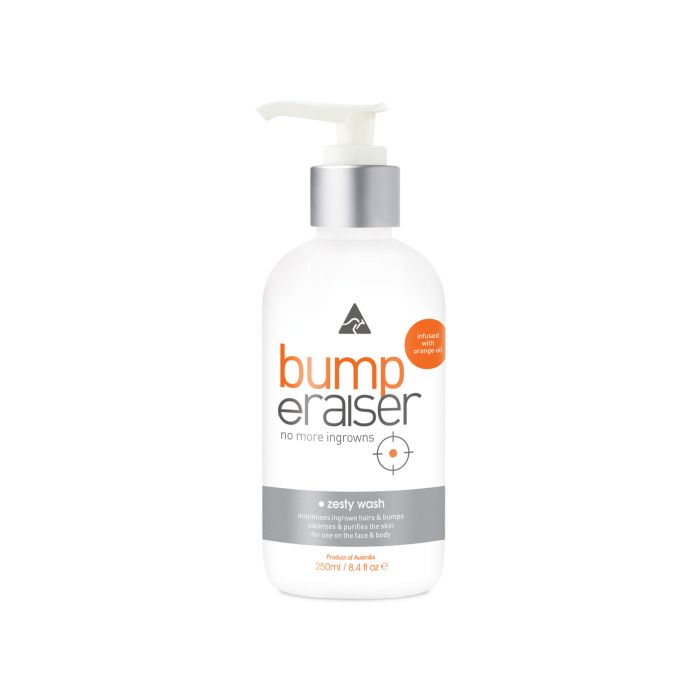 Bump eRaiser Zesty Antibacterial Wash thoroughly cleanses the skin and removes excessive oil to prevent the occurrence of ingrown hairs, bumps and breakouts. Tea Tree Oil, a natural anti inflammatory and antiseptic, helps to reduce ingrown hairs and the irritation associated with them. Infused with a zesty blend of Orange Oil and Guarana, it purifies and boosts the skins energy leaving it clear and smooth. Can be used on the face and body. Ideal for use before and after all forms of hair removal. Suitable for the whole family and handy pump for in shower use